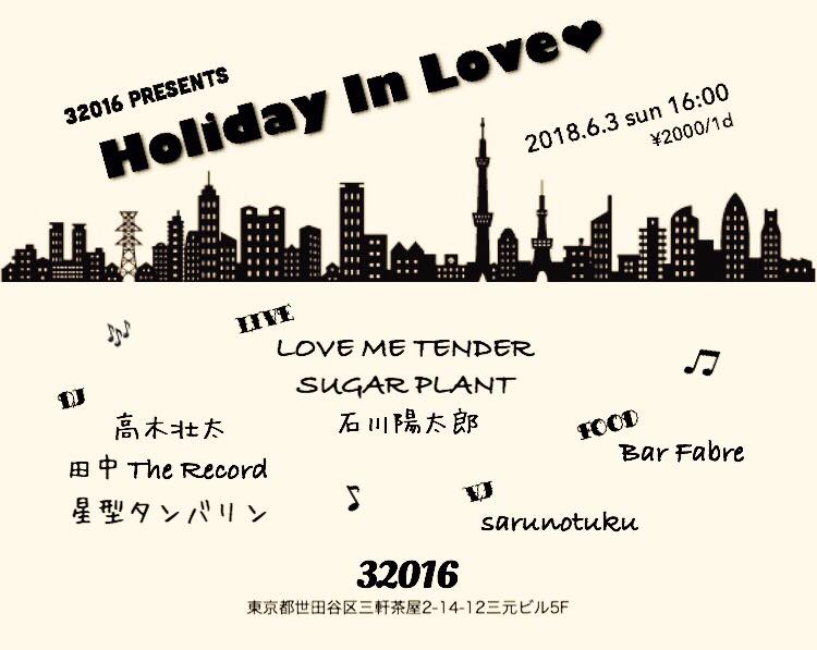 June 03, 2018 32016 presents Holiday In Love❤︎ 2018年6月3日(日)@32016 東京都世田谷区三軒茶屋2-14-12 三元ビル5F OPEN/START 16:00 2,000yen+1drink order LIVE: sugar plant, LOVE ME TENDER, 石川陽太郎 DJs: 高木壮太、田中The Record、星型タンバリン FOOD: Bar Fabre VJ: sarunotuku カテゴリなしの他の記事